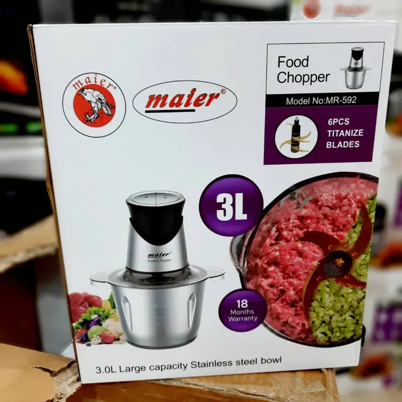 خردکن مایر مدل MR-592 یکی از محصولات قدرتمند برند معتبر مایر (maier) است که با تمرکز بر توان بالا و کارایی چندمنظوره طراحی شده است. این مدل با توان مصرفی ۲۵۰۰ وات در رده خردکن‌های پرقدرت بازار قرار می‌گیرد و به‌راحتی می‌تواند انواع مواد غذایی نرم و سفت را در مدت‌زمان کوتاه خرد یا مخلوط کند.