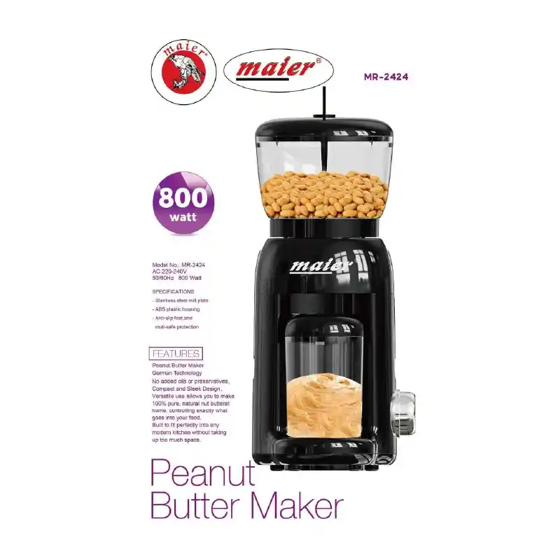 دستگاه کره بادام زمینی مایر آلمان مدل 2424 با ترکیب بدنهی پلاستیکیِ مقاوم و شفاف و تیغههای استیل ضدزنگ ساخته شده تا هم دوام داشته باشد و هم کنترل دیداری خوبی بدهد. موتور ۱۵۰ وات برای کاربری خانگی و کافههای کوچک کافی است و با ظرفیت ۴۰۰ تا ۵۰۰ گرم در هر نوبت، یک شیشه کرهی تازه تحویل میدهد. مخزن شفاف کمک میکند بافت را لحظهبهلحظه ببینید و نرمی کره را صرفاً با مدیریت زمانِ کار تنظیم کنید؛ زمان بیشتر یعنی بافت نرمتر. علاوه بر بادامزمینی، میتوانید با بادام، فندق، پسته، کنجد یا نارگیل هم کار کنید و در صورت تمایل طعمدهندههایی مثل نمک، عسل، دارچین یا شکلات اضافه کنید تا خروجی دقیقاً مطابق سلیقه یا رژیمتان باشد.